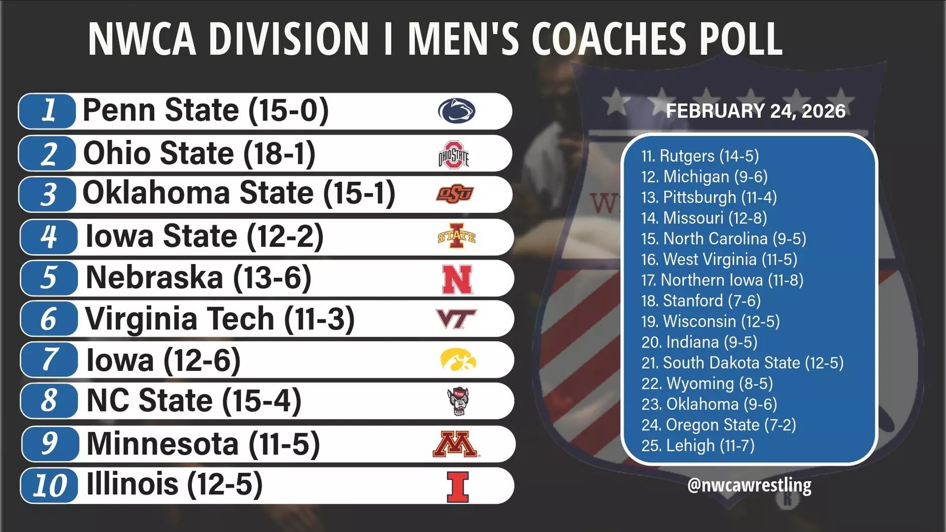 February 10 National Wrestling Coaches Association DI Men’s Coaches Poll