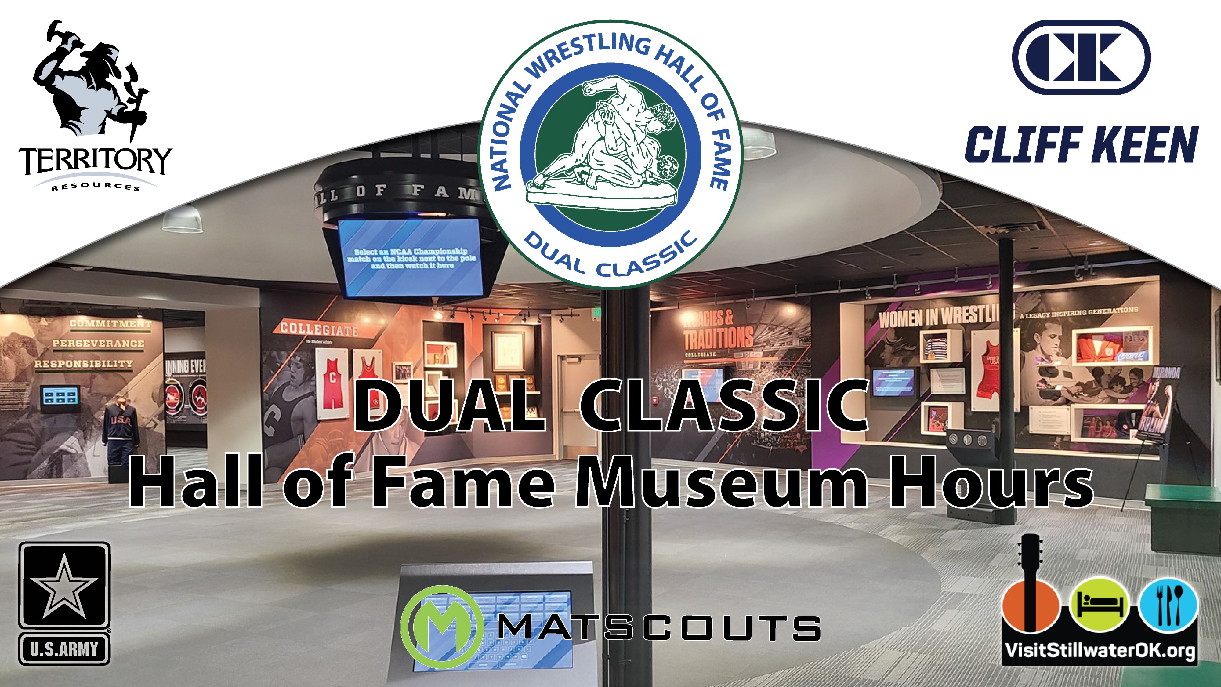 To accommodate the teams and fans attending the National Wrestling Hall of Fame Dual Classic presented by Cliff Keen Wrestling and Territory Resources in association with the United States Army and Visit Stillwater on December 20 and 21 at Stillwater High School, the Hall of Fame will have special hours on Thursday, December 19; Friday, December 20; and Saturday, December 21.