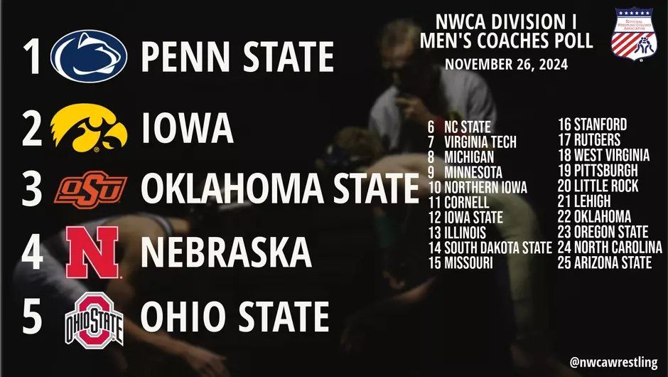 Methodology: The NWCA Division I Wrestling Coaches Poll is voted on by two coaches from each Division I wrestling conference. Each first-place vote is worth 25 points, 24 points for a second-place vote, 23 points for a third-place vote, and so on, through to one point for a 25th-place vote. The poll is based on dual meet results.