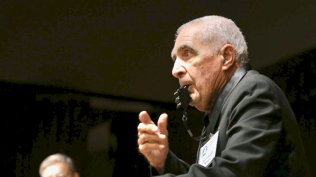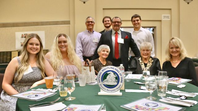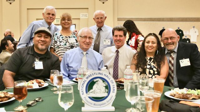 The 2023 Lifetime Service inductees for the California Chapter of the National Wrestling Hall of Fame were (front, left to right) John Phillips, Michael S. Young (deceased, accepted by his widow Cheryl), Mark “Cal” Calentino, Neal Campbell, (top, l-r) Dr. Kenneth C. Lane, Ricardo “Rich” Trevino, Michael Lengyel and Donald Apodaca. Also inducted were John Beresford (left below) who passed away at 94 on August 3, just before the event, and Tony Leon (right below) who was unable to attend the banquet held in the Laguna Hills Community Center on August 20 because his home in Brawley, east of San Diego, was in the projected path of a rare Category 4 Hurricane that threatened Southern California.