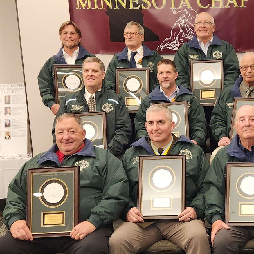 2025 National Wrestling Hall of Fame Minnesota Chapter inductees. Front (L-R): Dan Stifter, Chip Rankin, and Butch Steen. Middle (L-R): Brian Kelvington, Jeff Becker, and Tom Gravalin. Back (L-R): Mark Voyce, Chuck Marks, Jerry Schmitz, and Heidi Schmitz.