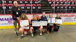 The Board of Directors of the Upstate New York Chapter want to thank a past honoree and Board member who assisted in the promotion of the first girls wrestling tournament in Section IV history this year. Hall of Famer, Rick Armstrong (2012) Section IV Wrestling Chairman, and Assistant Wrestling Chairman, Jeff Nolan, were very instrumental in organizing the championships at the Visions Federal Credit Arena. Brandon MacWhinnie also played a central role in facilitating the event. Additionally, Section IV Executive Director, Bill Bryant, and Chapter Board President, Carl Koenig, played a major role in making the girls’ tournament a success. A picture of the champions and Bill Byrant appears below.