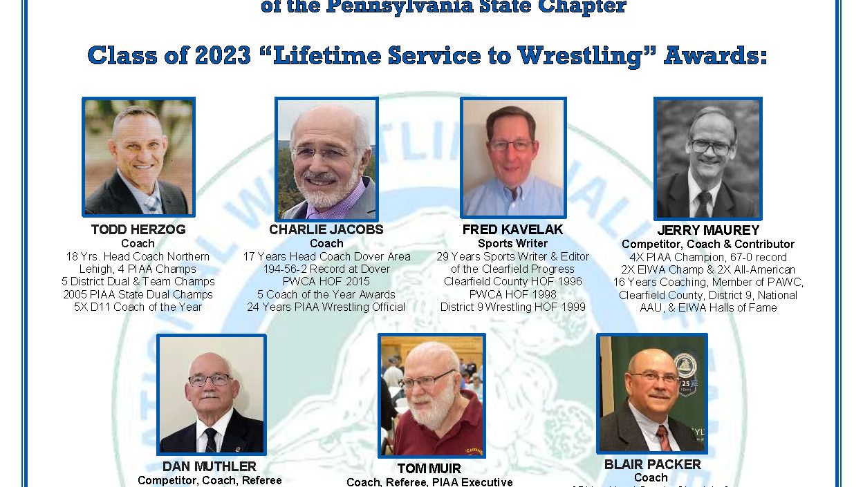 The Honors Banquet will be in Hershey, PA on April 30, 2023, and will welcome nine new inductees to the Hall. They are: Todd Herzog, Charlie Jacobs, Fred Kavelak, Jerry Maurey, Dan Muthler, Tom Muir, and Blair Packer as Lifetime Service to Wrestling Honorees. Keith Masser will be recognized as an Outstanding American, and Hunter Zondory in the Medal of Courage category.